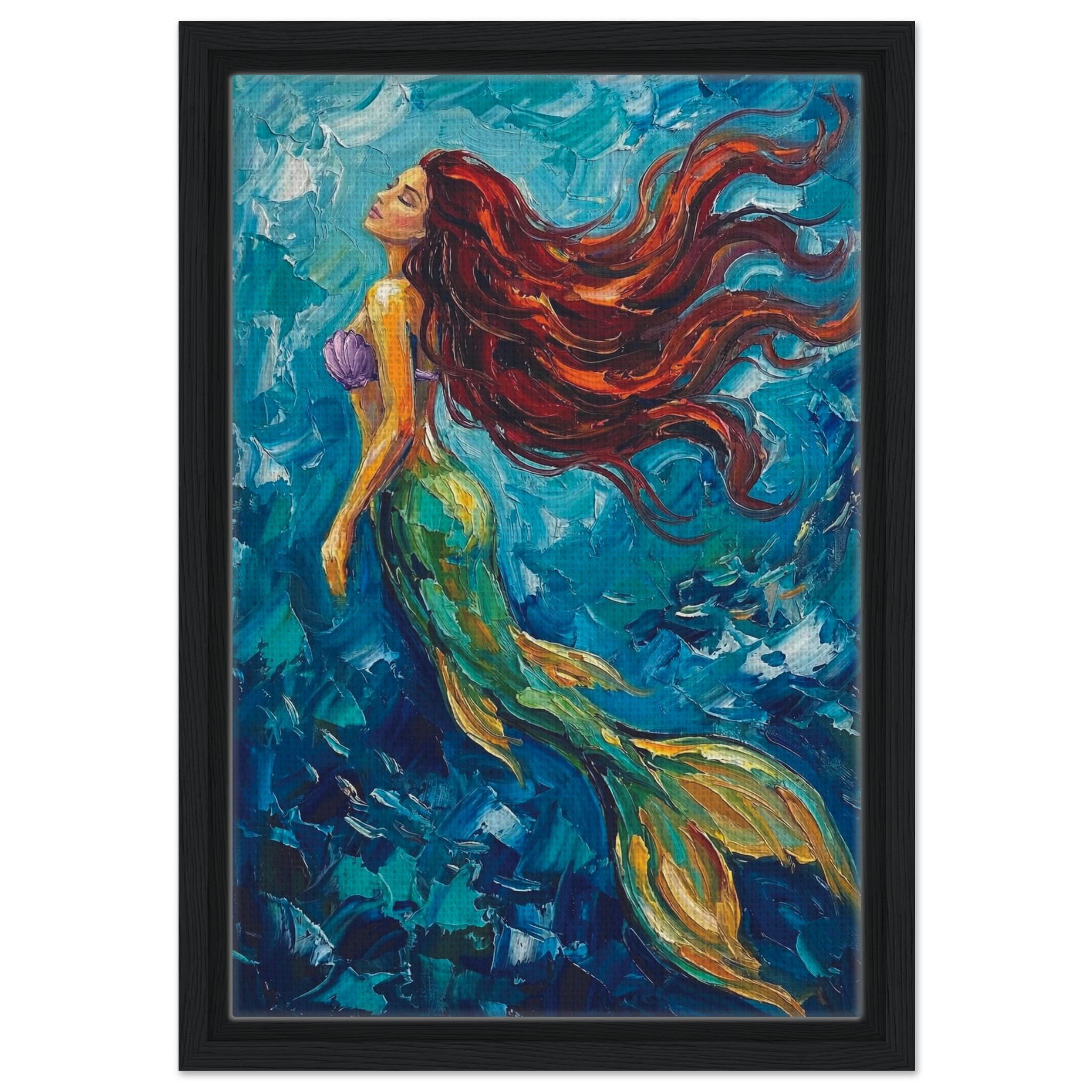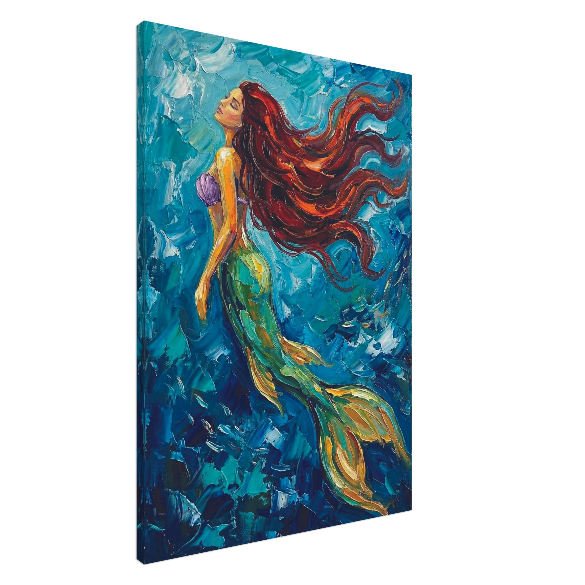 Rendered with rich brushstrokes and layered textures, the painting blends deep blues, seafoam greens, and soft pearlescent highlights to create depth and movement. The contrast between shadowy waters and the mermaid’s radiant form draws the eye instantly, making this piece a striking focal point without overwhelming your décor. There’s a sense of motion and quiet magic within the composition — as if you’ve stumbled upon a secret moment beneath the waves.