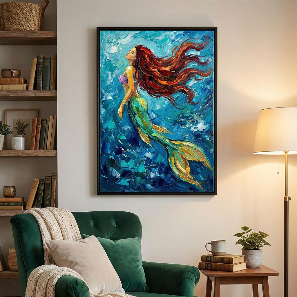 Perfect for bedrooms, living rooms, creative studios, or serene reading corners, this mermaid wall art adds an element of fantasy and elegance to both modern and eclectic interiors. Whether styled as a bold centerpiece or paired with other coastal or myth-inspired prints, it transforms any wall into a story waiting to be told.